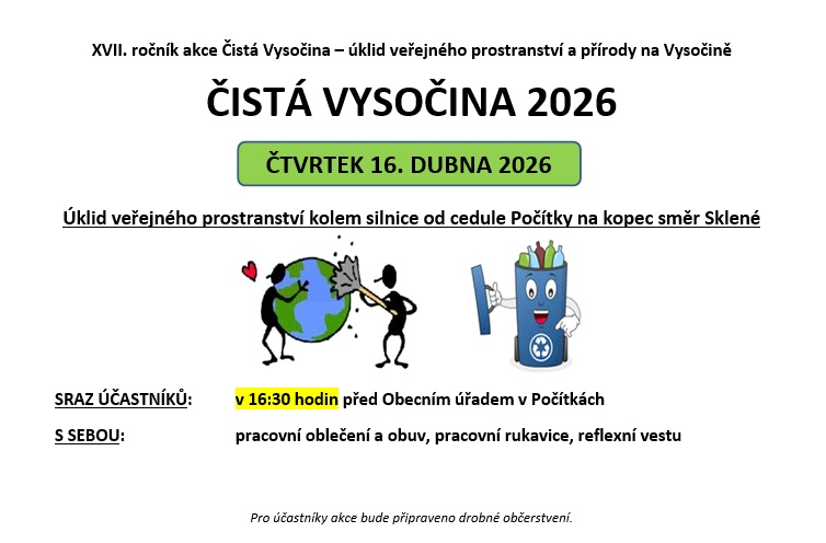Ve čtvrtek 16. dubna 2026 proběhne úklid veřejného prostranství v obci - trasa podél silnice od cedule Počítky na kopec směr Sklené.