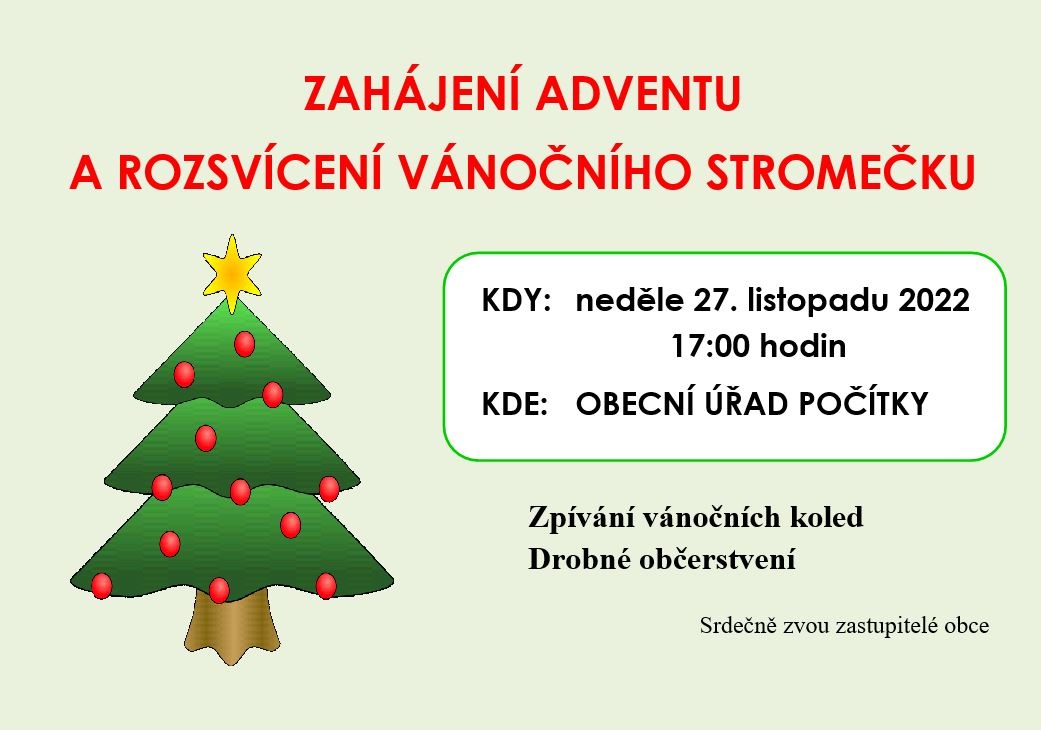 Zahájení adventu a rozsvícení vánočního stromečku se uskuteční v neděli 27.11.2022 od 17:00 hodin před obecním úřadem.